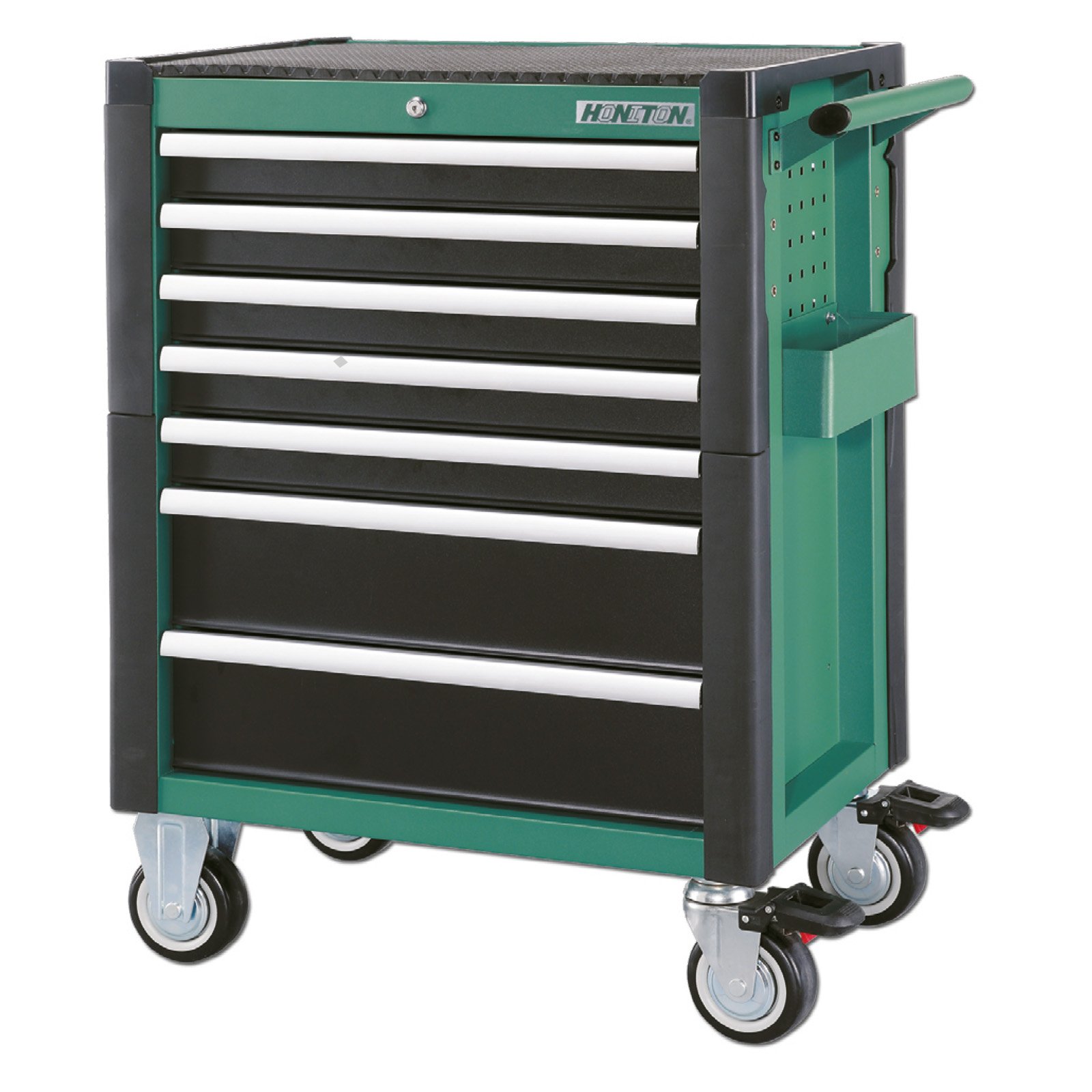 Kovový montážní vozík na nářadí se 7 zásuvkami. Dvě pevná a dvě otočná kolečka s poziční brzdou. Zásuvky na kuličkových ložiskách lze vysunout do 40cm. horní pracovní plocha i zásuvky jsou vypodloženy protiskluzovou podložkou. Součástí jsouuzamykatelné zásuvky. Má 5 nízkých a 2 vysoké zásuvky.