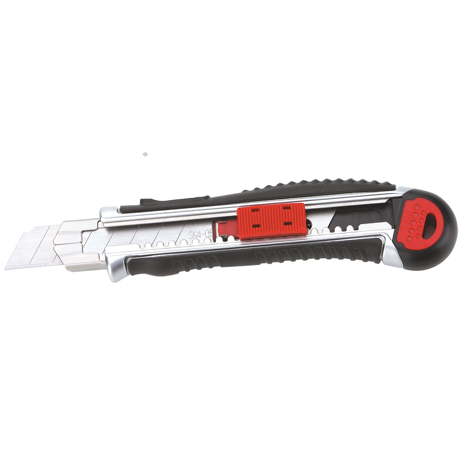 Celokovový ulamovací nůž s kovovou vodící lištou a pryžovým pláštěm. Ocelové vodítko čepele se vždy automaticky uzamkne proti pohybu a umožňuje rychlou výměnu náhradní čepele přímo ze zásobníku. Pogumovaná rukojeť s drážkami proti prokluzu.Vysouvač slouží jako zámek a rychlé výměně břitu. Vysouvací zásobník s 5 náhradními čepelemi.