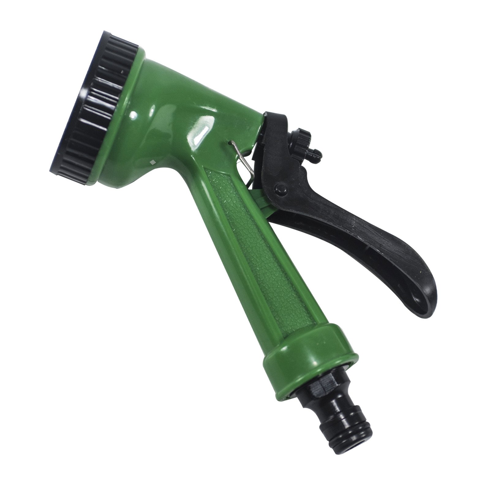 Hadicový postřikovač s pogumovanými prvky proti prokluzu. možnost regulace průtoku vody a aretace spouště.