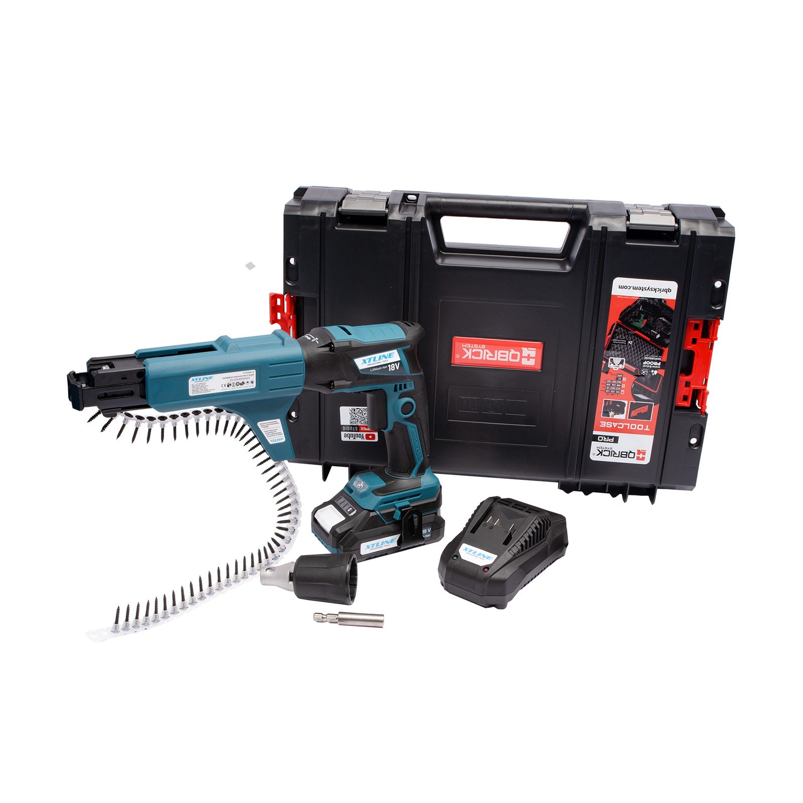 Aku šroubovák na sádrokarton bezuhlíkový 18 V + baterie 2.0 Ah + nabíječka 2.4 A + box XTLINE