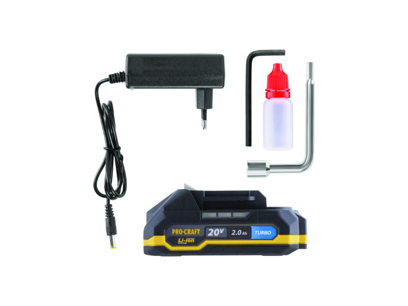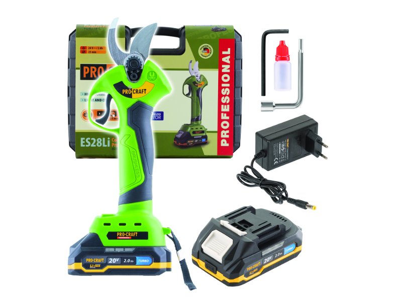 • balení obsahuje : Aku nůžky na větve Procraft ES28Li, baterie 20V 2Ah, nabíječka 20V 0,8A, montážní klíče, tuba na mazivo