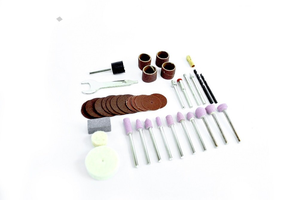 • součástí sady jsou ohebná hřídel o délce jednoho metru, 36 ks nástavců, vrtáky do kovu, plastu a dřeva,plastový kufr, držák