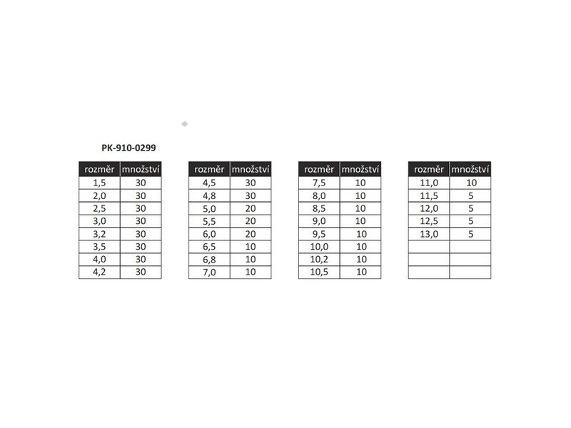 • vrtáky uloženy v plechovém boxu s označením jednotlivých rozměrů vrtáků