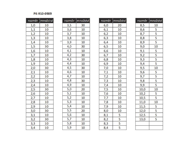 • vrtáky uloženy v plechovém boxu s označením jednotlivých rozměrů vrtáků