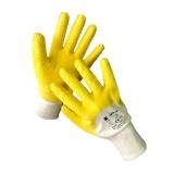 Rukavice s pružným nápletem, polomáčené v silné vrstvě žlutého latexu s protiskluznou úpravou