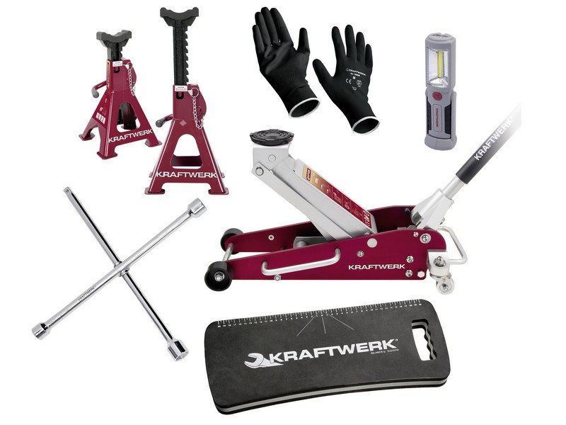 - 6-ti dílná sestava nářadí pro pneuservisy - hydraulický zvedák 3t s pedálem pro rychlozdvih - stavitelné 3t podpěry (2ks) - podložka na sezení a klečení - klíč křížový na kola 17 x 19 x 22 mm x 1/2" CrV - LED svítilna COMPACT MINI 180 - pracovní rukavice velikosti XL