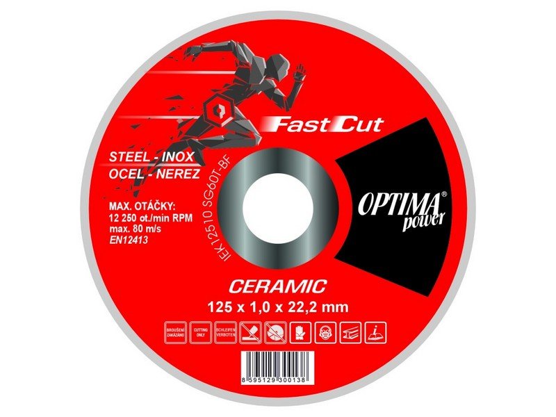 - ŘEZNÉ KOTOUČE OPTIMApower Ceramic FAST CUT - na nerez a ocel - typ SG60T-BF - tenké řezné kotouče OPTIMApower FAST CUT CERAMIC jsou extremně rychlým a výkonným nástrojem pro profesionální použití na oceli a nerezi - speciální technologie se zárukou dlouhodobé životnosti a absolutní bezpečnosti - tvar: T41 - typ zrna: keramika - pojivo: pryskyřice - průměr uchycení: 22.2 mm - tvrdost: T - tvrdý