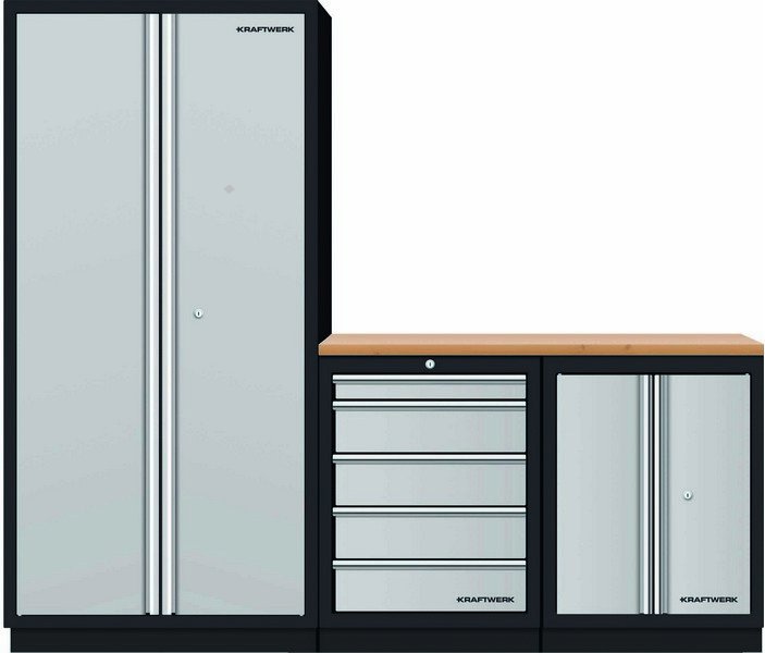 - modulární nástěnný systém skříněk MOBILIO - volně stojící konstrukce pro velmi flexibilní instalaci - zásuvky různých výšek, uloženy na kuličkových ložiscích - s centrálním zamykáním, včetně pojistek u jednotlivých zásuvek - pro výbavu KRAFTWERK COMPLETO / EVA / EVA3 - stěnové panely s EURO perforací - multiplex pracovní deska tl. 35 mm z bukového dřeva, s ochranným lakem z lněného oleje obsahuje: - 4x skříňka horní - 1x skříň 1 dveře, 4 police, uzamykatelná, 600x458x2000mm - 1x skříňka spodní 4 zásuvky 680x458x910mm - 1x skříňka spodní 2 dveře 680x458x910mm - 1x skříňka spodní 5 zásuvek 680x458x910mm - 3x výztuha zadní 1420x65x30mm bez otvorů - 2x deska Multiplex (bukové dřevo) 1361x463x35mm -1x skříň 2 dveře, 4 police, uzamykatelná, 915x458x2000mm - 1x skříňka spodní 9 zásuvek 680x458x910mm - 2x výztuha zadní 1420x65x30mm bez otvorů - 4x panel zadní děrovaný 600mm s čtvercovými otvory