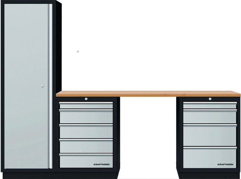 - modulární nástěnný systém skříněk MOBILIO - volně stojící konstrukce pro velmi flexibilní instalaci - zásuvky různých výšek, uloženy na kuličkových ložiscích - s centrálním zamykáním, včetně pojistek u jednotlivých zásuvek - pro výbavu KRAFTWERK COMPLETO / EVA / EVA3 - stěnové panely s EURO perforací - multiplex pracovní deska tl. 35 mm z bukového dřeva, s ochranným lakem z lněného oleje obsahuje: - 4x skříňka horní - 2x skříň 1 dveře, 4 police, zamykatelná - 1x skříňka spodní 2 dveře 680x458x910mm - 1x skříňka spodní 4 zásuvky 680x458x910mm - 1x skříňka spodní 5 zásuvek 680x458x910mm - 3x výztuha zadní 1420x65x30mm bez otvorů - 1x deska Multiplex (bukové dřevo) 680x463x35mm - 1x skříňka spodní7 zásuvek na kolečkách - 1x deska Multiplex (bukové dřevo) 2041x463x35mm - 2x výztuha zadní 1420x65x30mm bez otvorů - 4x panel zadní děrovaný 615x24x1052mm s čtvercovými otvory