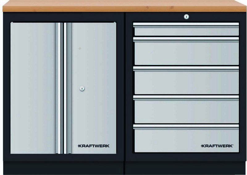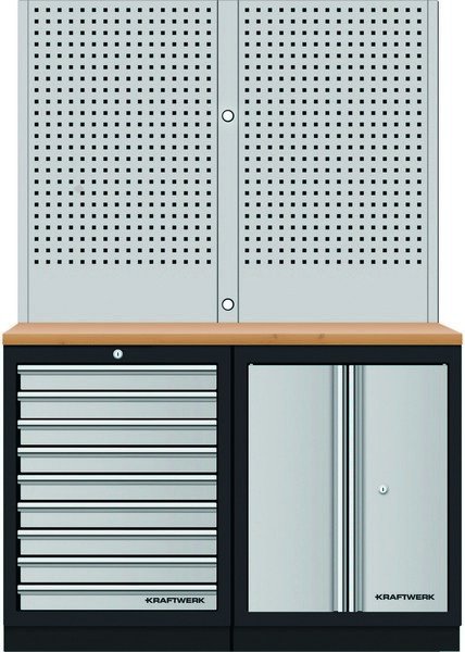 - modulární nástěnný systém skříněk MOBILIO - volně stojící konstrukce pro velmi flexibilní instalaci - zásuvky různých výšek, uloženy na kuličkových ložiscích - s centrálním zamykáním, včetně pojistek u jednotlivých zásuvek - pro výbavu KRAFTWERK COMPLETO / EVA / EVA3 - stěnové panely s EURO perforací - multiplex pracovní deska tl. 35 mm z bukového dřeva, s ochranným lakem z lněného oleje