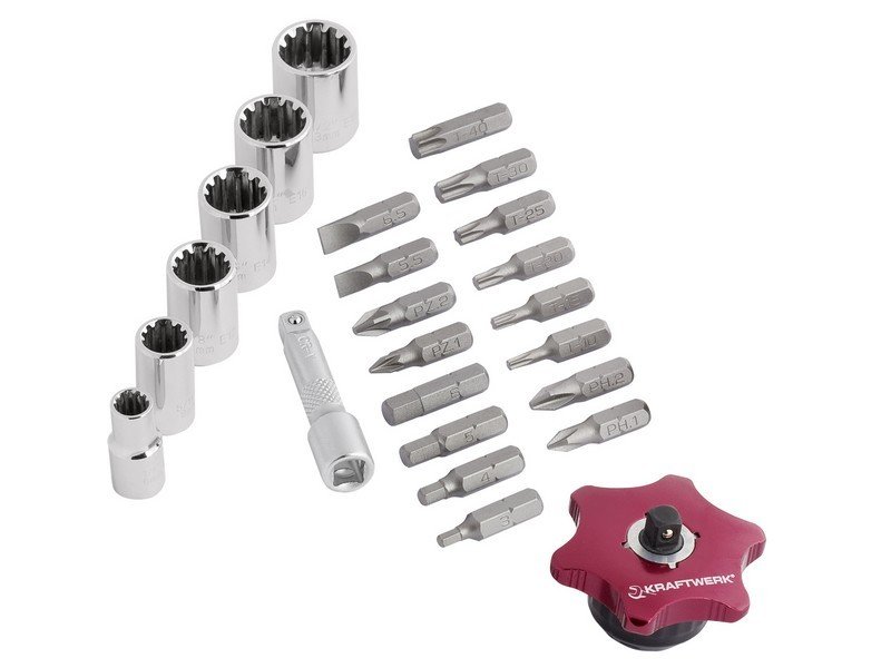 - 20 dílná souprava bitů - bity vyrobeny přesným kováním z chromvanadiové oceli S2 - tvrzené na 61-62 HRC - bit plochý, Inbus, PH, PZ, Torx, Square
