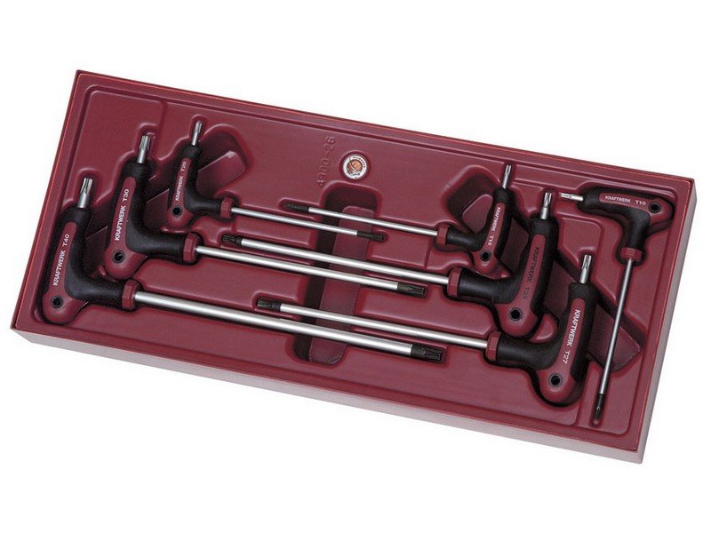 - 7-dílná souprava klíčů Torx T10-40 - "T" rukojeť - pevný systém se 2-mi omyvatelnými plastovými vložkami navržen pro vybavení dílenských vozíků - označení rozměrů v plastových vložkách - přesné a praktické uložení nářadí - určeno pro vozíky B107, B117, P205, P207, P206, P407, P407L, P306, P308, EXTRA LARGO, P203